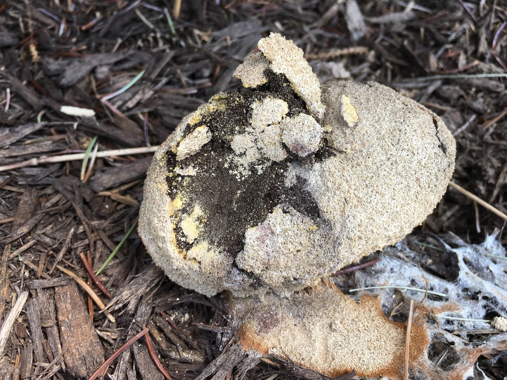 Fuligo septica is more commonly called “Dog Vomit Slime Mold” or “Scrambled Egg Slime Mold” and is fairly common in wet urban mulch. As it matures it darkens and dries out, releasing spores in the wind.